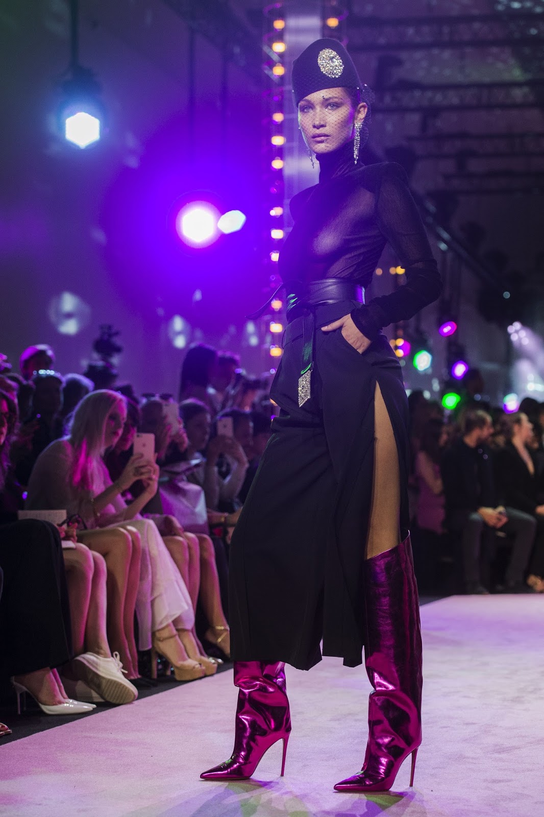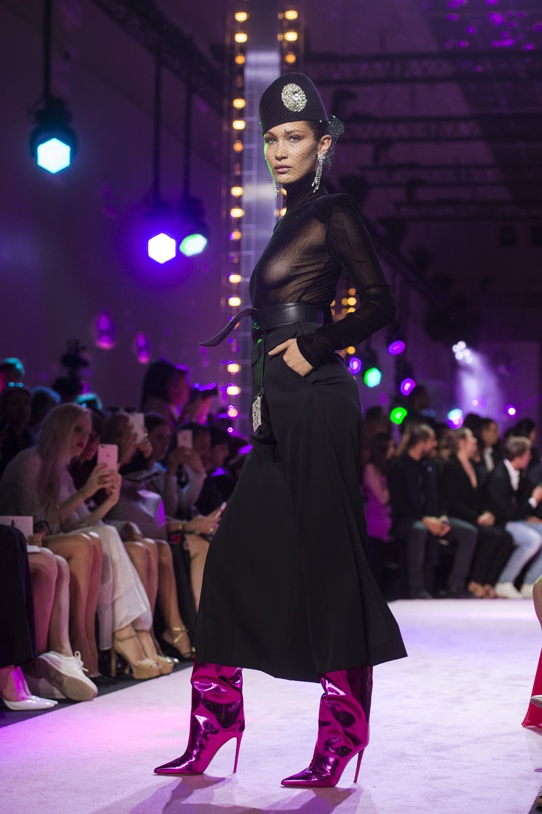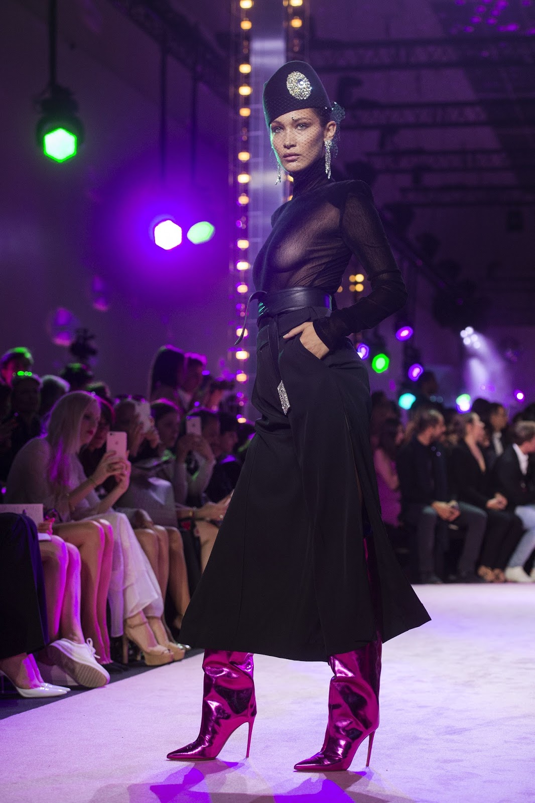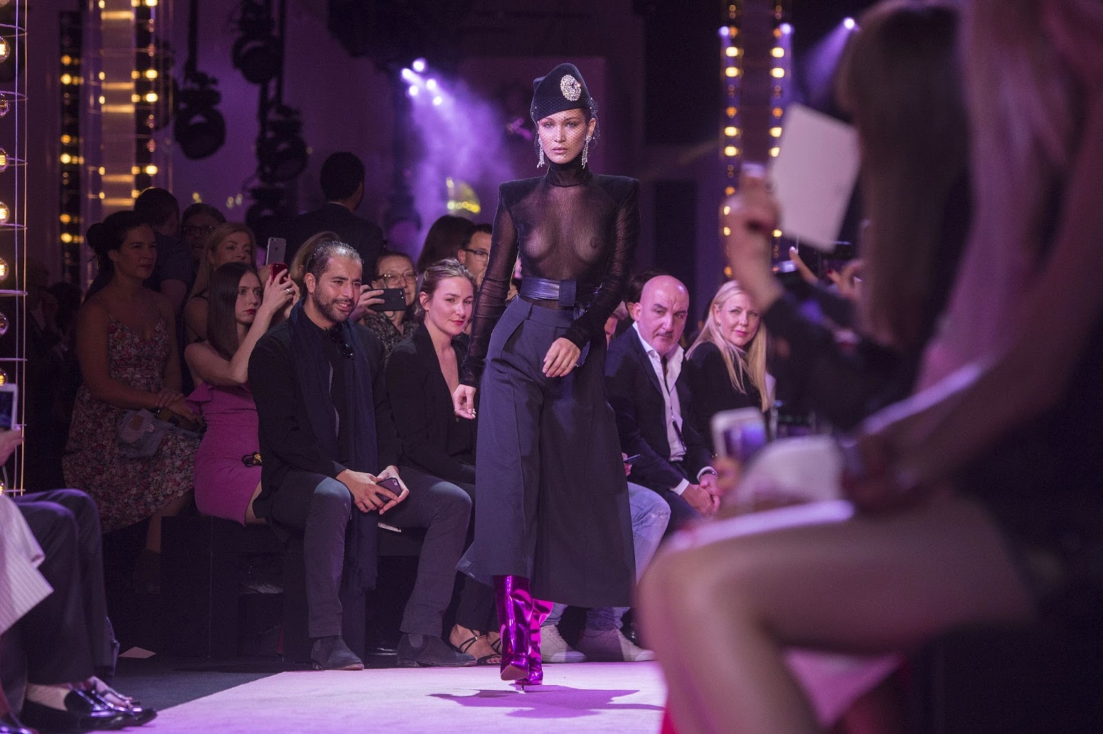 Durante um desfile em Paris, Bella Hadid desfilou com um vestido bastante transparente, que deixou os seus seios à vista de todos.