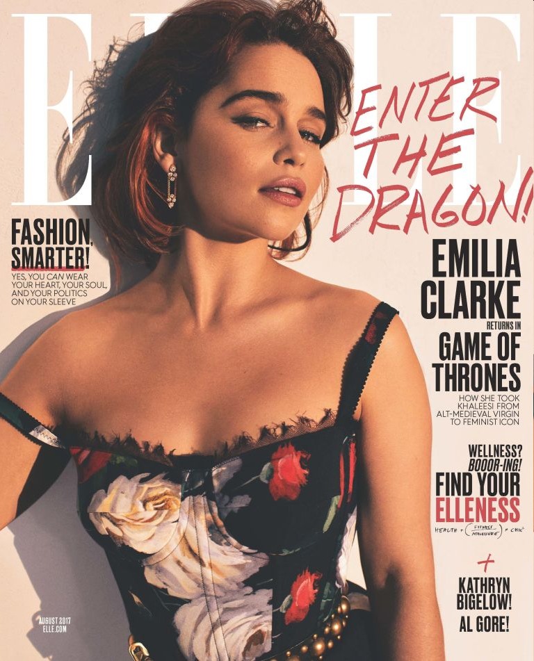 Algo fixe: gosto do corte de cabelo de Emilia Clarke aqui, na capa de agosto de Elle Magazine. Ela costumava usar o seu cabelo real, mas agora, está a usar o cabelo um pouco mais curto o que se adequa a ela. Dito isto, “Enter the Dragon” não deve ser a linha da capa, a menos que esteja na capa o Drogon! Drogon pertence à capa de Elle. Talvez se Drogon lhe disser que as skinny jeans são tanto 2009, vais ouvir. O que há para 2017? Maquilhagem de fogo e gelo, cabelos brancos e devoradores dos inimigos da tua mãe. Deus, eu queria que Drogon estivesse na capa. Em vez disso, nós conseguimos que Emilia fale sobre como é sexista apontar que Emilia parece ser obrigada a mostrar as mamas o máximo possível?