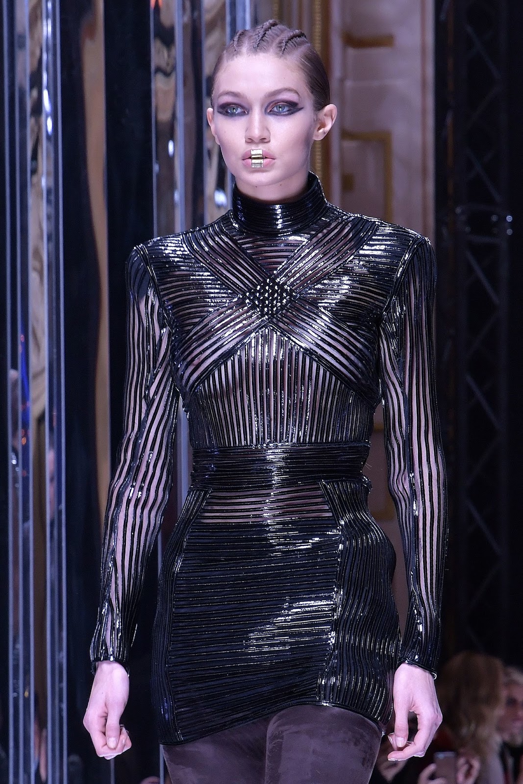 Num dos desfiles da semana de moda de Paris, Gigi Hadid desfilou com roupa bastante transparente.
